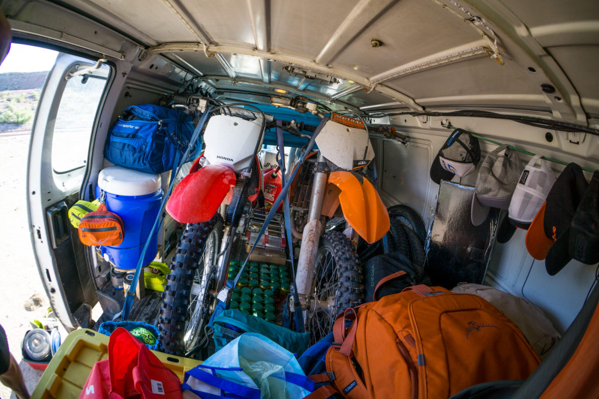 Fortunately for us, Syd’s parents had an Autohome Airtop roof-top tent that they were no longer using, so we “long-term borrowed” it, stuck it on the roof and attached a custom hinging bike rack to the rear. Excluding the car-top tent, our “conversion” cost us under $1,500 because we eschewed standard van conversion requirements–namely aesthetics–and focused on making the van the ultimate toy hauler. In addition to the car-top tent and the bike rack, we purchased a rotating seat base ($250), moto chocks ($70), a K2 cooler that holds ice for days ($329), some tape LED lighting ($8) and built some shelving out of discarded lumber (free). Then we called it a day and hit the road.